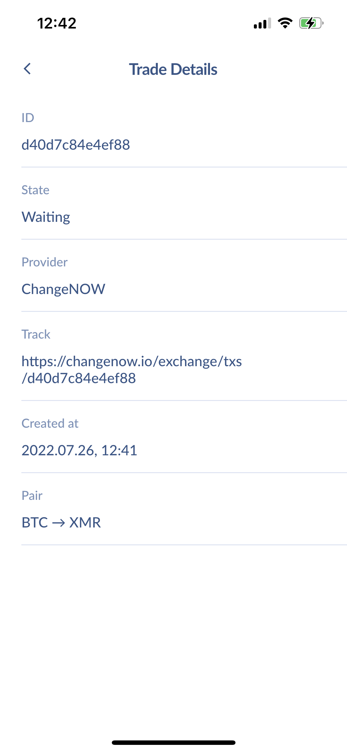 Cake will compose the transaction, show final screen with all details right before you press "Send". Finally, you will see the trade details screen. You can track the status of the swap there. The status will display "Finished" when an swap has been completed. You can also tap "Track" to track your trade with the provided link. You can always come back to this screen by swiping to the right of your balance, and tapping on the swap in your Transaction History.