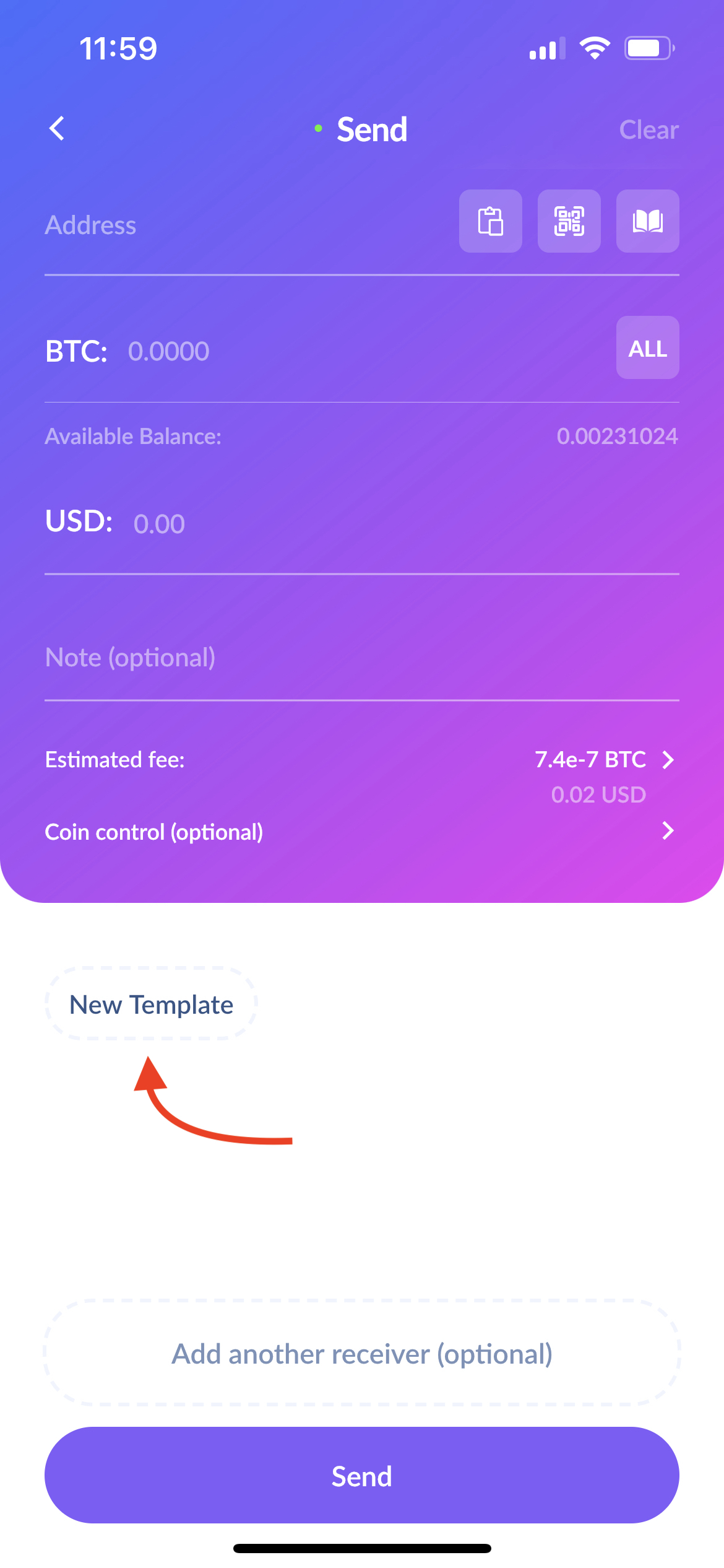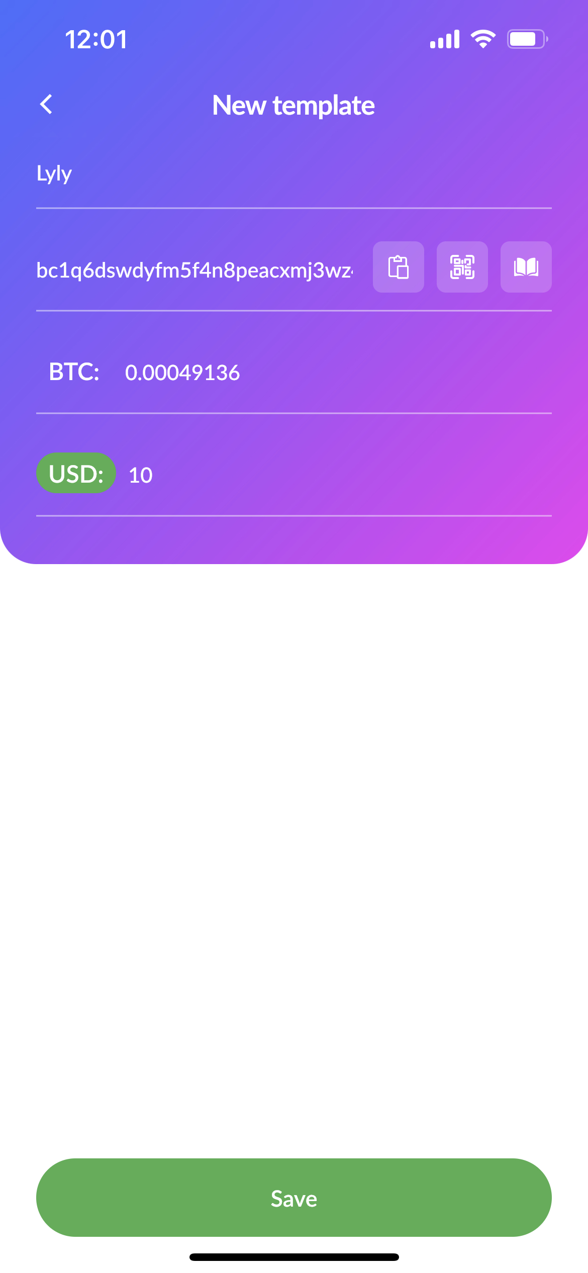 You can use templates for your most common transactions. To create a new template, tap "Send", then tap "New" under "Templates" at the bottom. Create a name for this template, paste the address, fill in the amount, and press the "Save" button. Tap on the template name to use it. Press and hold the template's name if you would like to delete it.