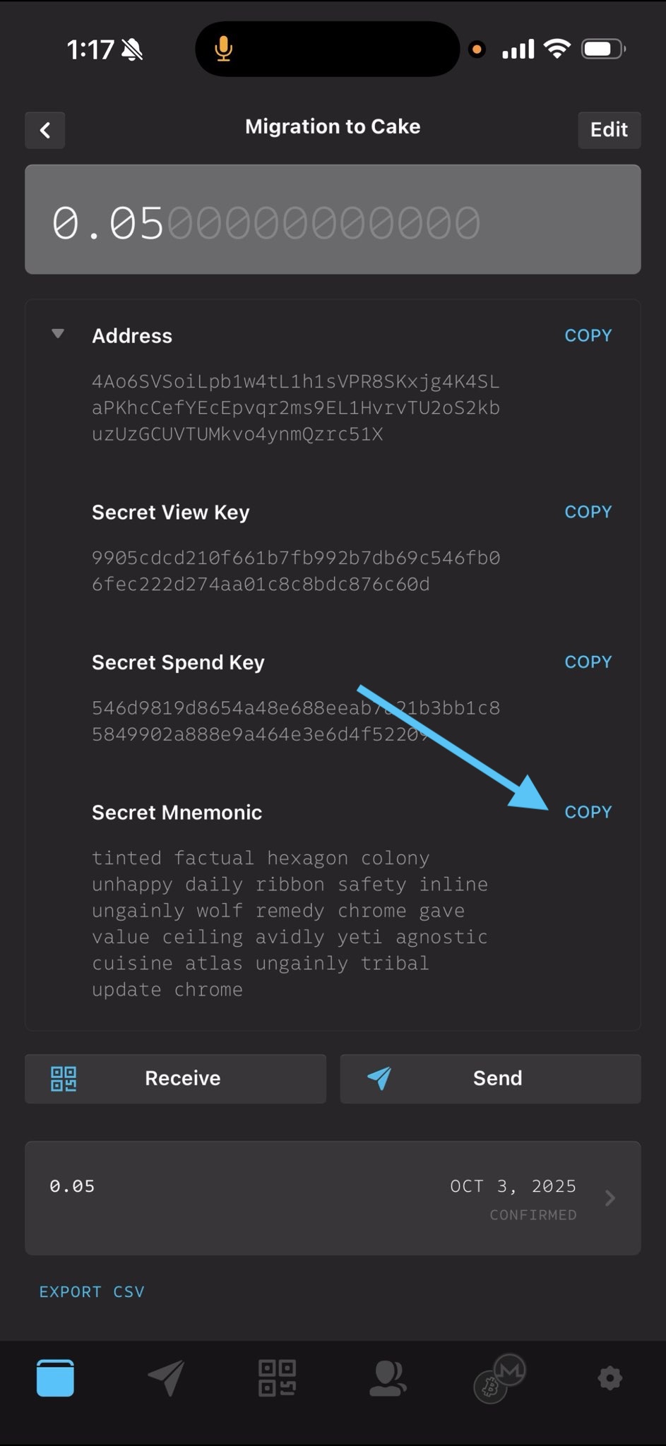 For those who want to preserve their transaction history or have a specific reason to keep using their existing MyMonero seed phrase, you can easily export it and restore in Cake Wallet.