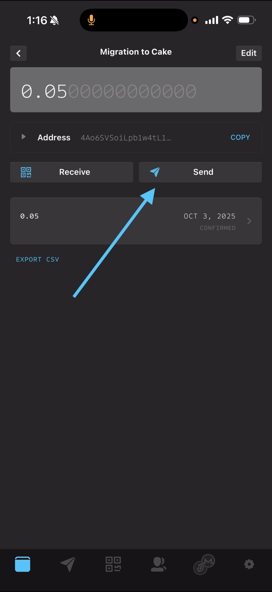 to send the entirety of your Monero balance to your new Cake Wallet, then tapSend