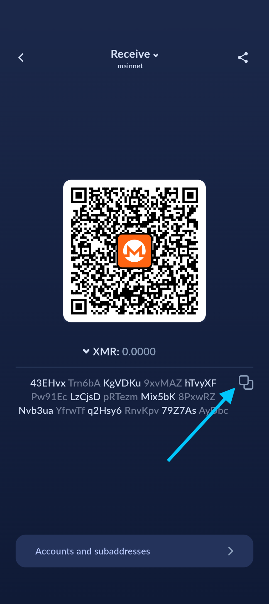 on the bottom dock to display a QR code with a Monero receive address- Note: If necessary, you can easily copy or share the address by tapping the icon next to the address, then sending to yourself via a messaging app, email, etc.